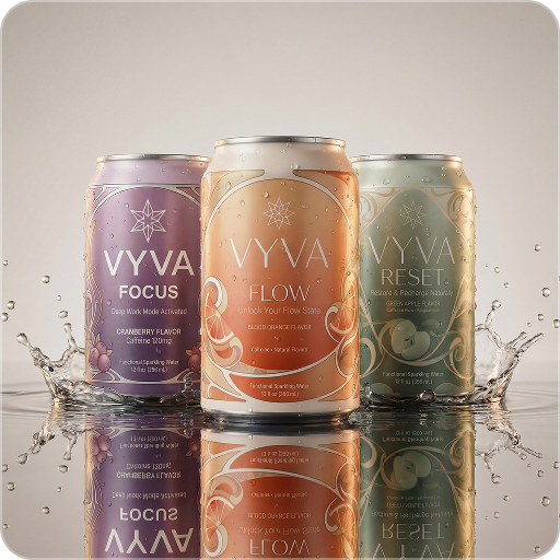 VYVA is a premium sparkling water brand designed around mental states, turning everyday hydration into a refined, intentional ritual.