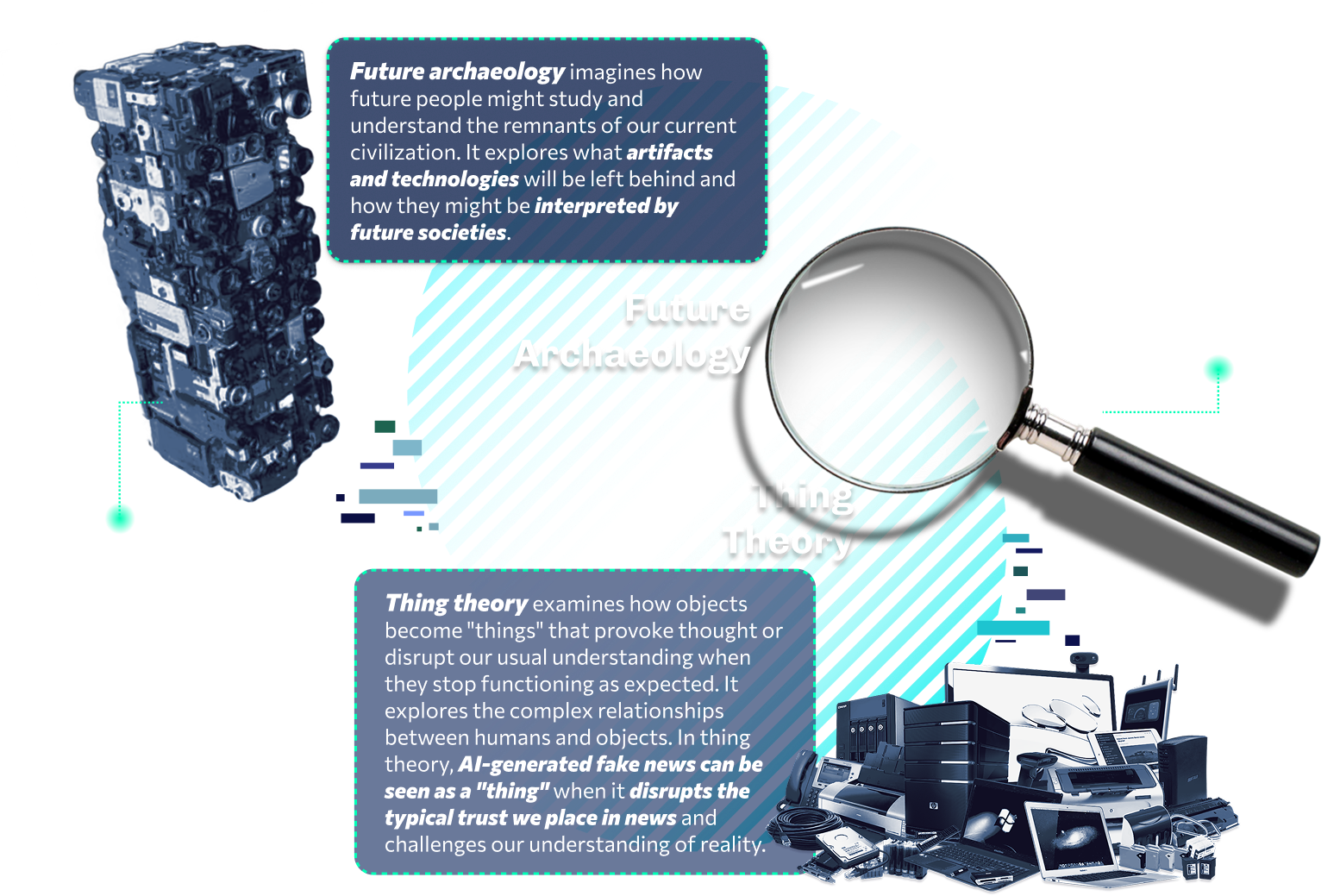 Future archaeology imagines how future people might study and understand the remnants of our current civilization. It explores what artifacts and technologies will be left behind and how they might be interpreted by future societies. Thing Theory examines how news media are more than just tools—they have meaning, history, and influence. By combining these two, our project delve into how future societies might interpret AI-generated fake news and their cultural significance.