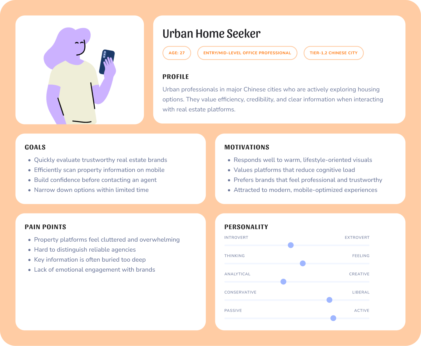 Using lightweight persona synthesis and empathy mapping methods, I identified that target users are highly sensitive to time cost and cognitive load. They prefer visually scannable experiences that quickly signal relevance. These insights directly informed the decision to structure the experience around clear lifestyle categories rather than dense listings.